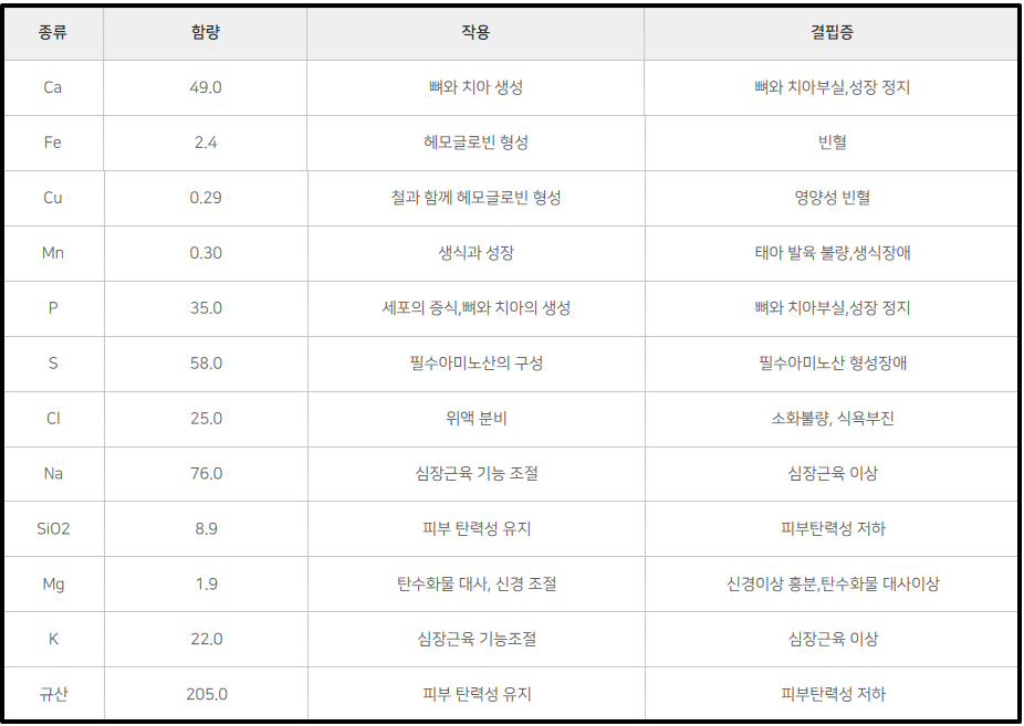 위 성분을 요약하며 포도당, 과당, 자당, 올리고당, 17종의 아미노산, 10종의 비타민, 12종의 미네랄, 유기산,