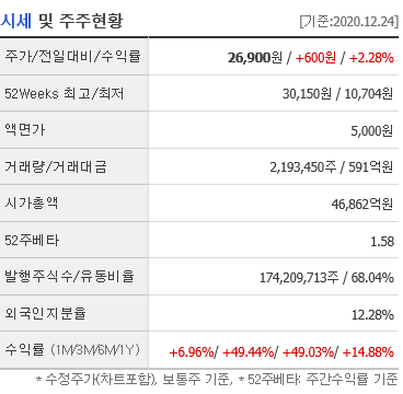 시가총액은 현재 4조 6,6862억 원으로 코스피 60위이며 상장된 주식수는 174,209,713입니다.