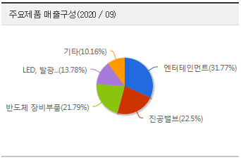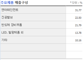 매출의 구성은 엔터테인먼트 32%, 진공밸브 22.5%, 반도체 장비 부품 22% 등의 구성입니다