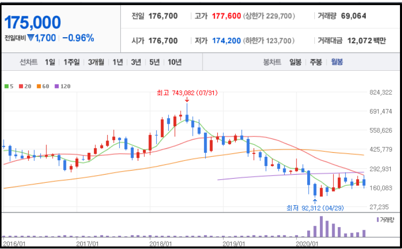 그런데 보톡스 등의 허가 취소의 악재로 인하여 주가가 많이 하락하였습니다.