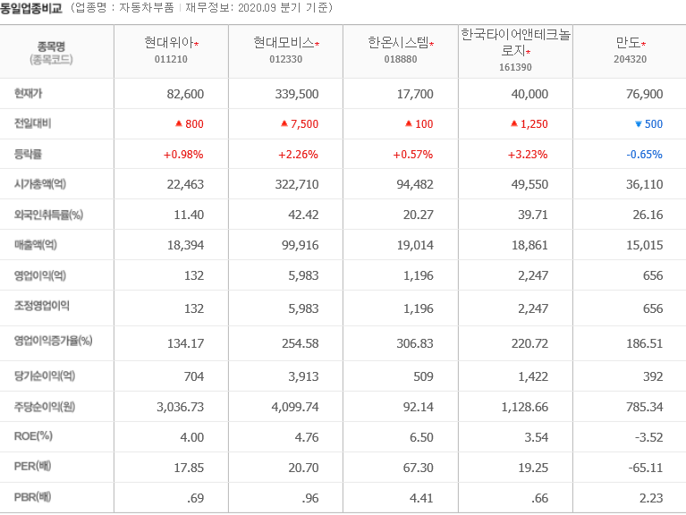 LG전자, 한온시스템, 만도, 현대모비스등이 있습니다.
