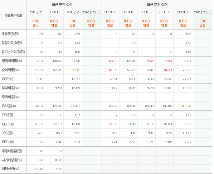 2020년 3분기 기준으로 자산이 995억, 부채는 125억, 자본금 420억, 이익잉여금은 429억입니다.