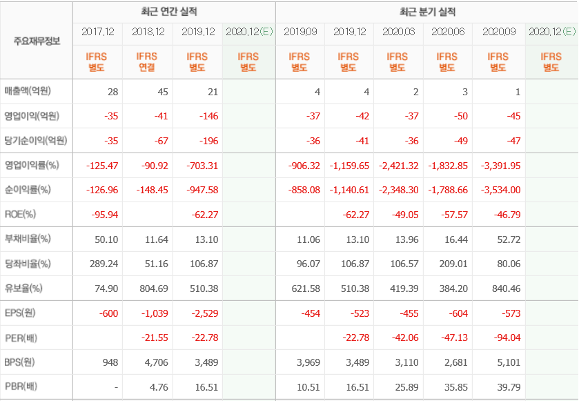 영업이익은 마이너스 상태이며 부채비율이 조금씩 늘어나고 있는 모습니다.