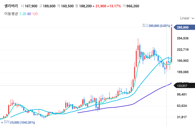 오늘 1월 22일 기준으로 본다면 셀리버리는 몇일째 상한가를 보이고 있습니다.