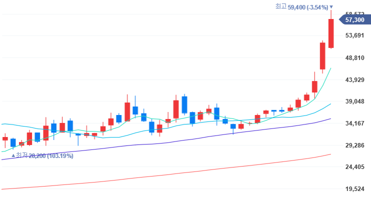 52주 최고가는 59,400원이며, 최저가는 21,000원입니다.