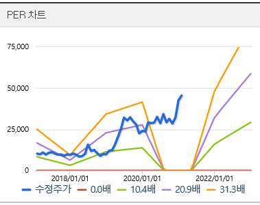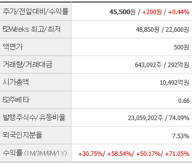 52주 신고가는 47,750원을 기록 하였으며, 최저가는 22,600원입니다.