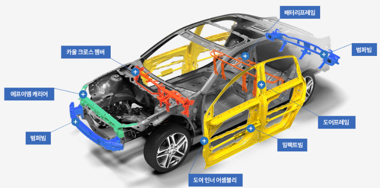 그리고 자동차 생명인 안전부분인 카울크로스멤버의 경우 자동차의 비툴어짐과 휘어짐을 방지하고 차체의