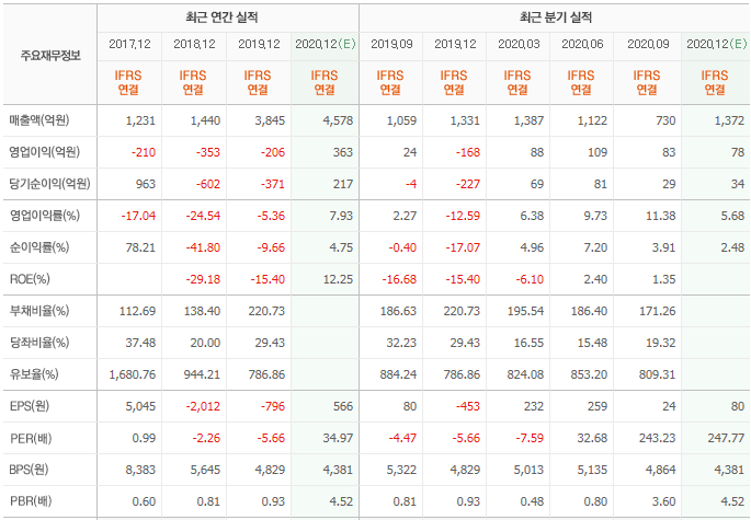 영업이익은 매년 적자에서 허닥이다가 지난해 흑자로 전환하였습니다.