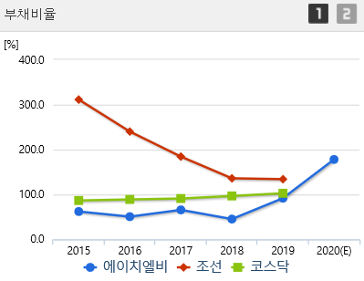 부채비율이 지난해 2019년 대비 많이 올라 갔습니다.