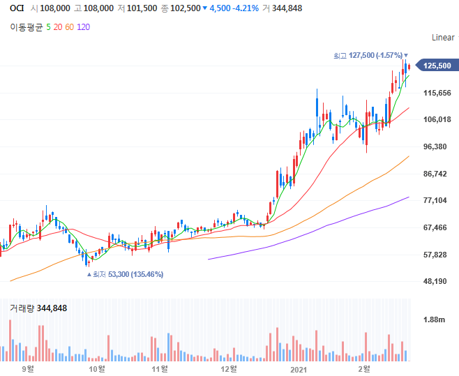이미 OCI는 올해 들어 3개월간 무려 80%의 주가상승이 있었습니다.