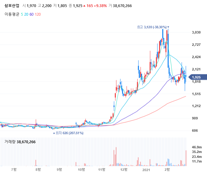 '20년 10월 800원대의 삼보산업의 주가는 3000원대까지 치솟게 됩니다.