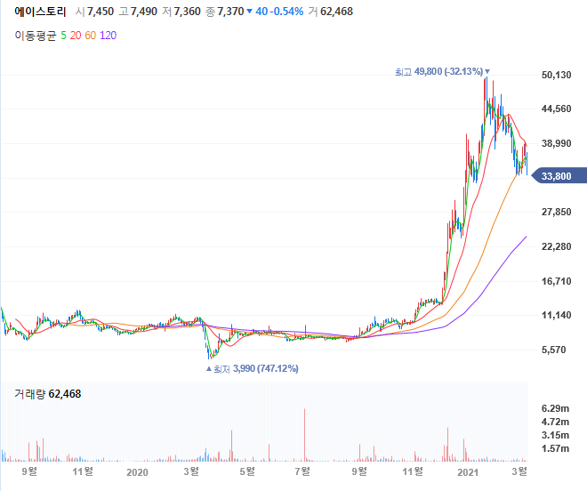 작년에 에이스토리 주가는 1년 사이 무려 3~4배가 올랐네요