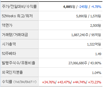 2016년 상장하였으며, 52주 최고가는 5,890원, 최저가는 1,570원 입니다