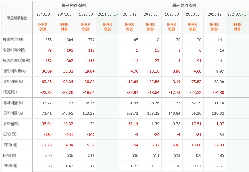 영업이익과 당기순이익이 계속 적자로 힘든 시기를 보내고 있네요