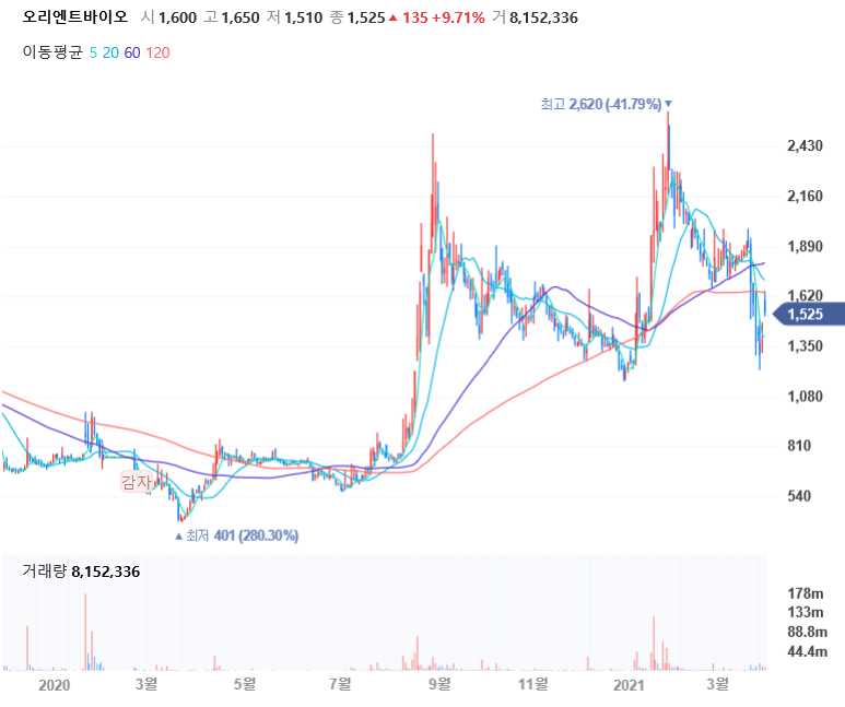 있습니다. 오리엔트바이오의 시총은 1800억원대로 코스피 600위에 머므르고 있습니다.