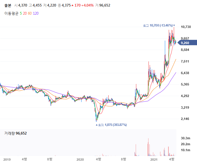 솔본의 일봉 차트를 보면 여지없이 올해 초 최저가를 기록후 계속 상승을하여 얼마전 최고가를