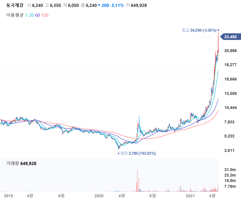 일봉차트를 보면 지난해 초 최저가를 찍고 계속 우상향 하다 올해 상반기 너무 가파른 상승을 하였습니다.