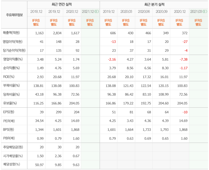 영업이익과 순이익이 많이 줄어 들었으나 부채비율은 오히려 낮아 졌습니다.