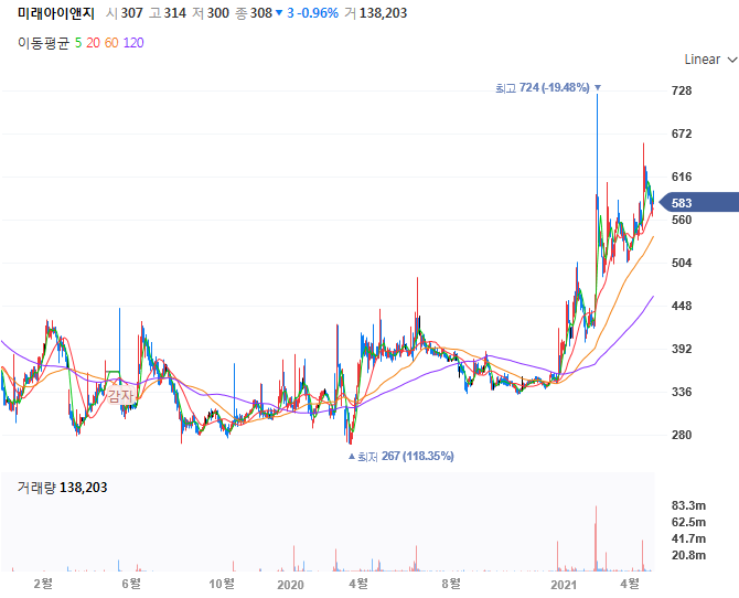 차지하고 있습니다. 미래아이앤지의 52주 최고가는 724원이며, 최저가는 332원입니다.