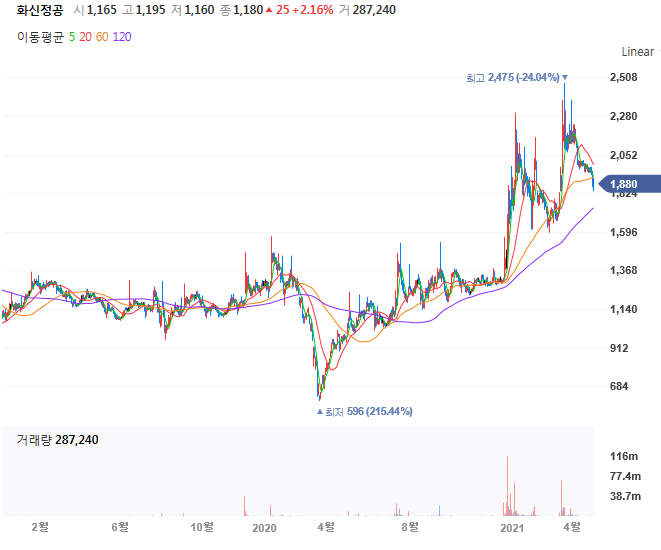 화신정공의 시가총액은 684억원으로 코스악 1180위 정도에 머물러 있습니다.