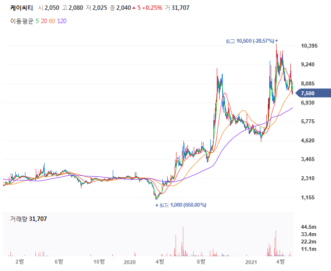 케이씨티 주가가 많이 올라온 것은 사실이나 워낙 장이 좋았던 지라 대부분 많이 올랐습니다.
