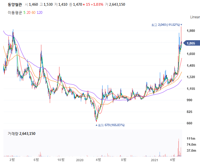 현재 동양철관의 시가총액은 2100억원 이상으로 코스피 590위 정도입니다.