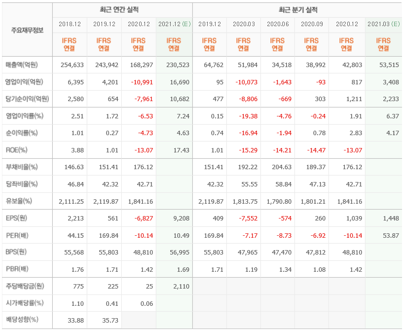 영업이익과 당기순이익은 흑자 전환에 성공하였으며 올 상반기 배당액은 2110원을 책정하였네요