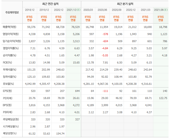 2021 상반기 매출액은 거의 8조에 이르고 영업이익은 5200억 원, 당기 순이익은 3500억 원으로 안정적인 현금흐름을 보여주고 있습니다. 단 부채비율은 늘어났으나 시총 대비 불안하지 않은 상황입니다.