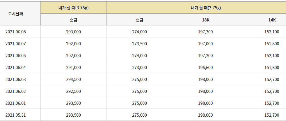 18K 금시세는 내가 팔때 약 197,300원 정도 됩니다. 14K 금시세는 152,100원입니다. 백금 시세는 거의 동일하게 판매할 때 가격이 156,000원 이네요