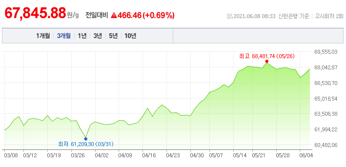 금 값이 또 올랐네요. 물론 고시회자 2회차라 아직 단정지을 순 없습니다. 계좌 고객입금시 가격은 68,524.33원/ 고객 출금시가격은 67,167.43원/ 실물을 고객이 사려면 71,238.17원 / 고객이 파는 경우64,453.59원 입니다.