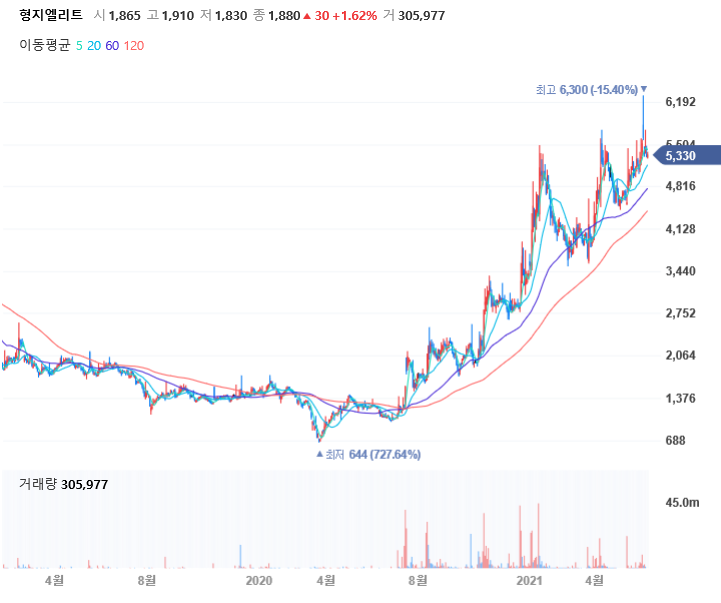 일봉 차트를 보면 지난해 초부터 계속 우상향 하는 상황을 보고 있습니다. 고점을 찍고 현재 가격 조정 중에 있으나 아직 상승할 여력이 남아 있어 보입니다.