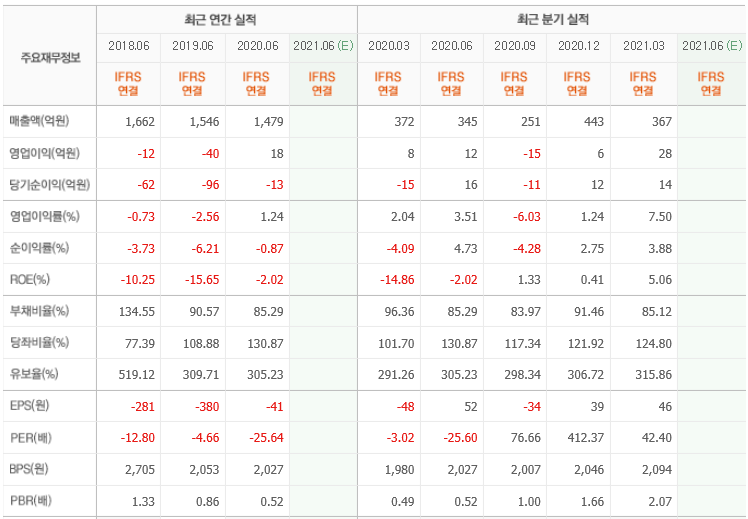 매출액은 조금씩 줄어들고 있으나 양호한 편입니다. 그리고 영업이익은 지난해 흑자전환에 성공하였죠! 다만 당기순이익은 아직도 적자 상태이나 현금흐름이 많이 좋아지고 부채비율이 줄어들었습니다.