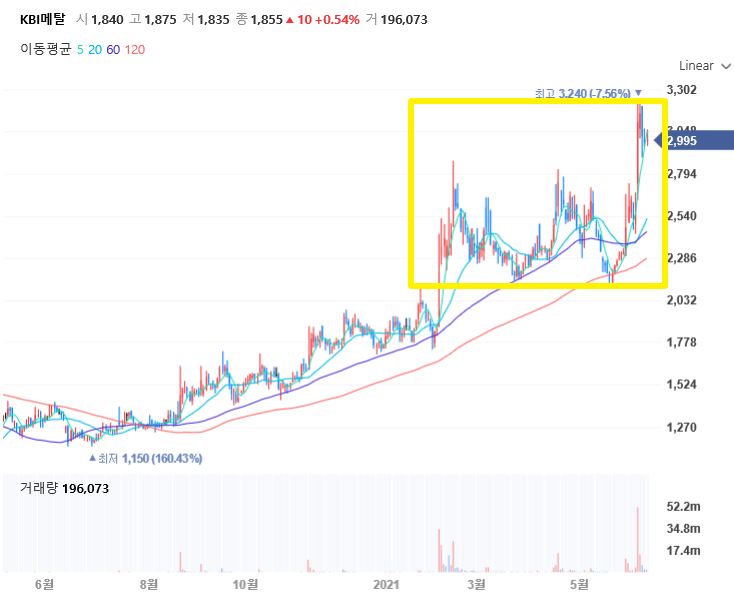 kbi메탈의 시총은 980억원대로, 현재까지 상장된 주식은 3200만 주 정도 되며, 이 중 외국인이 소유한 비율은 약 0.7% 정도로 22만 주 정도 가지고 있습니다. 지난 52주 최고가는 3240원, 최저가는 1150원입니다.