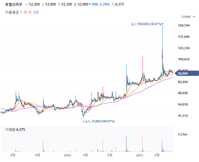 지난 52주 최고가는 15만 정도에 최저가는 58500원으로 갭 차이가 많이 나는군요. 호텔신라는 공항을 제외한 면세점 영업 정상화를 유지하고 있죠!