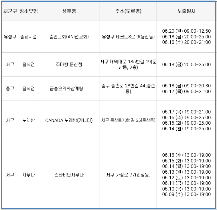 또한 서구 둔산동(서구 둔산로 73번 길 25)에 있는 캐나다 노래방에서 6/14(월) ~ 6/17(목) 저녁 7시부터 자정까지 노출이 되었으니 해당 시간에 방문하신 분들은 꼭 방역당국에 신고를 부탁드립니다.