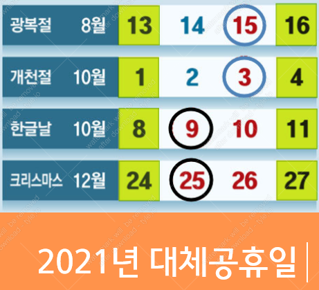 결국 올 하반기 우리는 4일의 추가 휴무를 얻게 되었습니다. 2021년 대체공휴일을 정리해 보자면 광복절 이후인 8월 16일(월), 개천절 이후인 10월 4일(월), 한글날 이후인 10월 11일(월), 크리스마스 이후인 12월 27일(월) 이렇게 총 4일입니다.