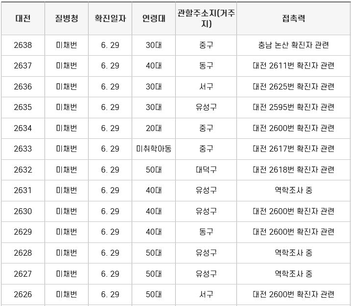 29일 자 기준으로 보면 서구 2명, 유성구 5명, 중구 3명, 대덕구 1명, 동구 2명입니다. 대부분 40~50대에서 확지자가 나왔습니다. 노래방이 가장 큰 것으로 보입니다.