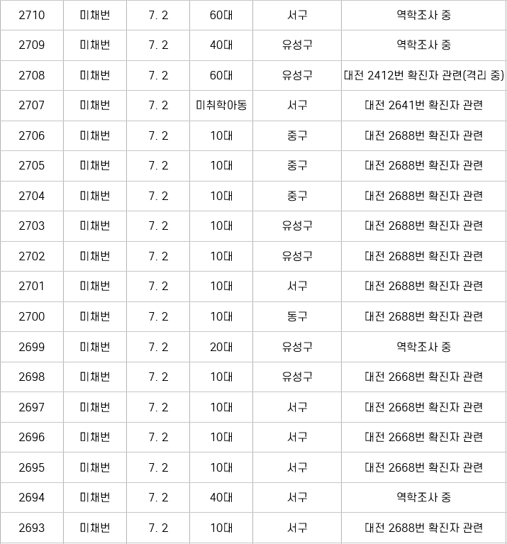 7/2 기준으로 대전 확진자 수를 보면 18명이 발생하였습니다. 동구 1명, 서구 8명, 중주 3명, 유성구 6명입니다. 거기다 관저동 금동초등학교 1학년 재학생이 부모님의 확진 판정과 대전여자상업고등학교 확진자 등이 나왔습니다.