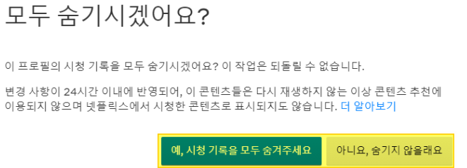시청기록 콘텐츠를 숨길 경우 해당 콘텐츠가 넷플릭스에서 시청한 영화나 TV 프로그램으로 표시가 되지 않습니다. 시청기록을 숨길 시 시청 중인 콘텐츠 줄에도 콘텐츠는 표시되지 않는다는 것을 알고 있어야 합니다.