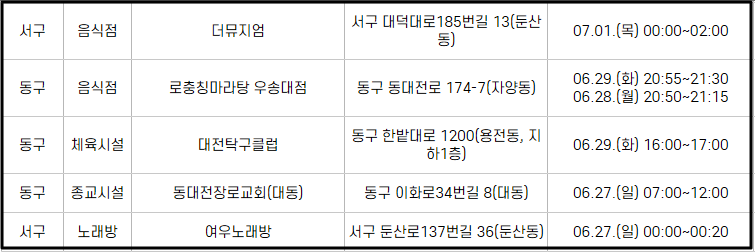 역시나 노래방이 빠질 수 없는데요 자양동에 있는 이브노래방은 7월 2~7월 6일까지 코로나 확진자 동선 확인이 되고 있었습니다. 그리고 둔산동 시애틀 노래방 방문하신 분들도 꼭 확인이 필요해 보입니다.