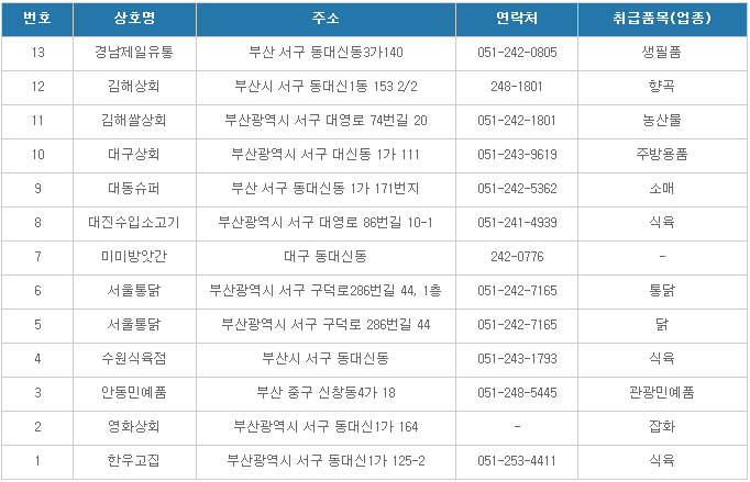 동대신 골목시장의 가맹점만 올려 드려 보겠습니다. 나머지 시장의 경우 해당 시장 안에 있는 모든 가맹점에서 온누리 상품권 사용처입니다.