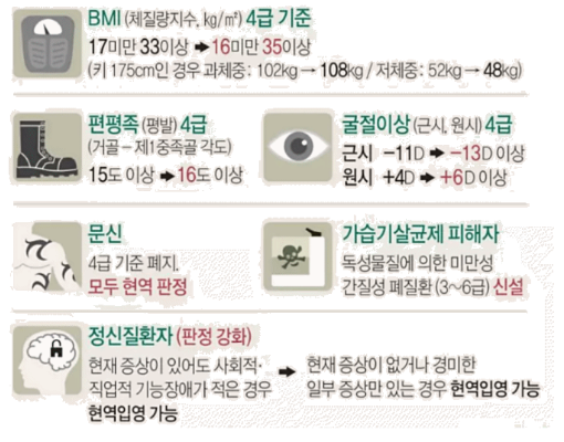 여기까지 알아본 군대면제조건중 군면제 몸무게와 기타 변경된 내용에 대하여 알아보았습니다. 조금이나마 군입대 준비하는 분들에게 좋은 정보가 되길 바랍니다. 끝.