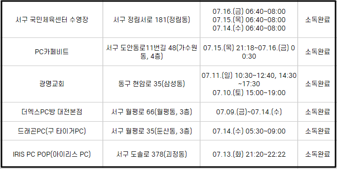 기타 장소는 지난 시간에 올려 드린 아래 장소와 같습니다. 정림동에 있는 체육센터 수영장에서도 제법 많은 날 노출이 되었기에 아래와 같이 방문을 한 분들은 빠른 시일 내 방역당국에 신고 후 코로나 검사 권장합니다.