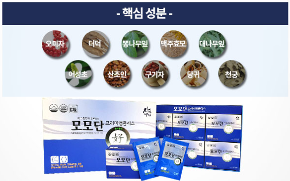 면역력에 도움을 주는 엽록소의 함량이 125mg이나 됩니다. 일일 섭취량의 엽록소는 125~150mg이죠! 거기다 부가적인 성분으로 오미자, 대나무 잎, 더덕, 진피, 어성초, 산조인, 맥주효모, 작약, 천궁, 당귀, 복령, 구기자, 뽕나무 잎 등의 천연성분으로만 만든 제품이네요
