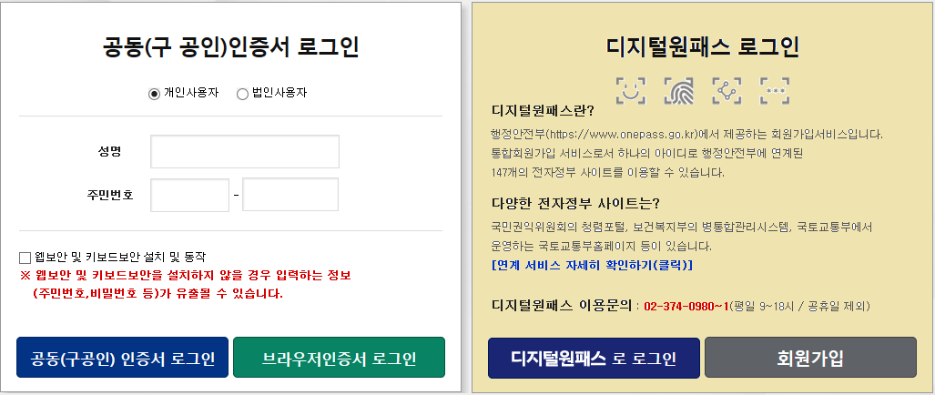 경찰청 이파인을 이용하기 위해선 웹보안이나 키보드 보안 설치를 해야 주민번호와 비밀번호 등의 유출을 막을 수 있기에 반드시 설치한 후 신원확인을 통한 인증과정을 필요로 합니다. 생각보다 간단하기에 공인인증서를 사용 시 디지털원 패스를 눌러 진행하면 쉽게 간편 로그인 가능하다.