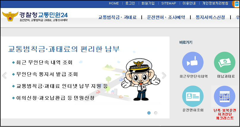 검색란에 이파인 또는 경찰청 교통민원24을 검색하여 홈페이지에 접속한다. 아래 회원가입을 눌러 간단하게 개인정보를 입력한 뒤 로그인을 하면 된다. 이파인을 통하여 최근 무인단속내역과 미납과태료 등을 조회 가능하기에 교통범칙금과 과태료를 인터넷 납부가 가능하다.