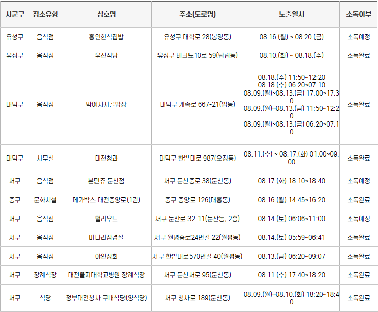 아래와 같은 장소가 공개되었습니다. 봉명동에 있는 홍인한식 집밥, 탑립동 우진 식당, 법동에 있는 박여사시골밥상, 오정동 농수산물시장, 둔산동 본만쥬, 대흥동 메가박스 1관, 둔산동 할리우드 식당, 월평동 미나리삼겹살, 월평동 야인 상회, 둔산동 을지대병원 장례식장, 둔산동 정부 대전청사 구내 양식당 등에서 노출이 되었으니 외출을 하시는 분들은 아래 장소를 한 번 더 확인하시길 권장합니다.