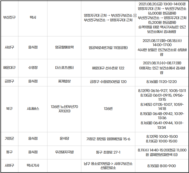 부산의 경우는 택시 기자분들이 확진 노출이 많은 편 입니다. 아래와 같은 날짜와 시간대 택시를 이용한 분들은 반드시 확인하여 보건방역 당국에 신고를 해야 합니다.