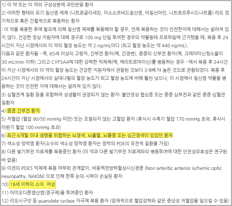 18세 미만과 여성, 중증의 간부전 환자, 저혈압 환자, 최근 6개월 이내 뇌출혈이나 뇌경색 심근경색 등으로 생명의 위협을 받았던 환자, 협심증 환자, 색소성 망막염 환자, 다른 발기부전 치료제 복용 중인 환자 등이다.