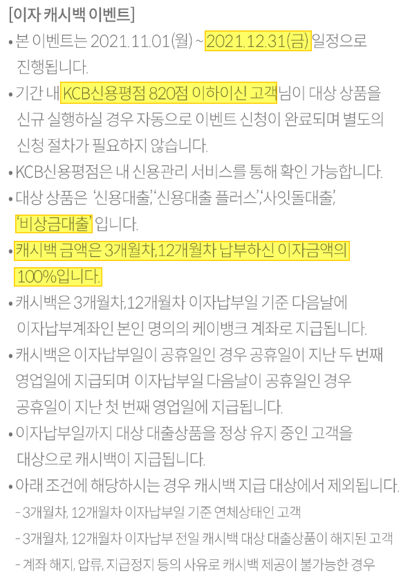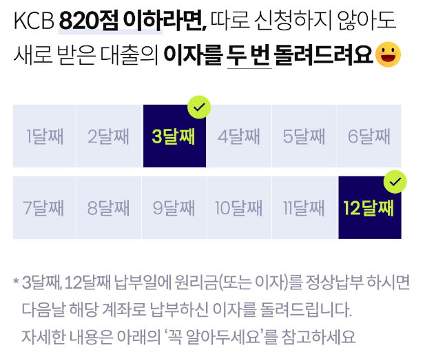 2021년 12월 31일까지 KCB신용평점 820점 이하인 경우 신청 필요 없이 3달째, 12달째 이자 납부일에 원리금과 이자를 정상 납부한 경우 다음날 해당 계좌로 납부한 이자를 돌려준다.